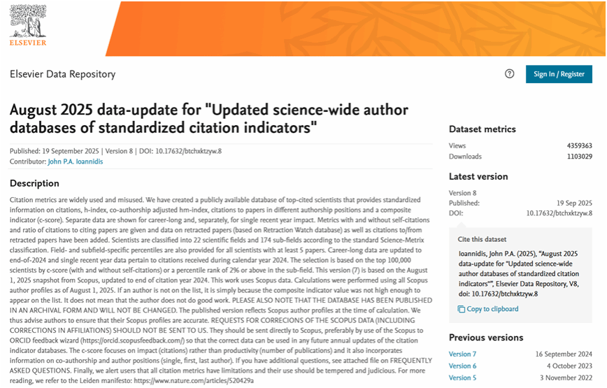 全球前2%顶尖科学家榜单基于Scopus数据库的引用数据系统分析,以被引数(区分自引和他引,提供自引数据)、H指数、HM因子等6种综合指标(Composite score,C-score),根据“生涯影响力”和“年度影响力”从近700万名科学家中遴选出世界排名前2%的科学家,分为22个领域和176个细分子领域。榜单提供了面向科学家长期科研表现的衡量指标,客观真实反映科学家的学术影响力。