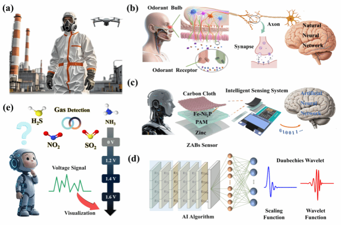 传感器应用场景示意图(a)、人体嗅觉系统示意图(b)、基于ZABs的智能传感系统 (c)、神经网络模型和Daubechies小波尺度函数 (d)、可视化传感器概念图 (e)