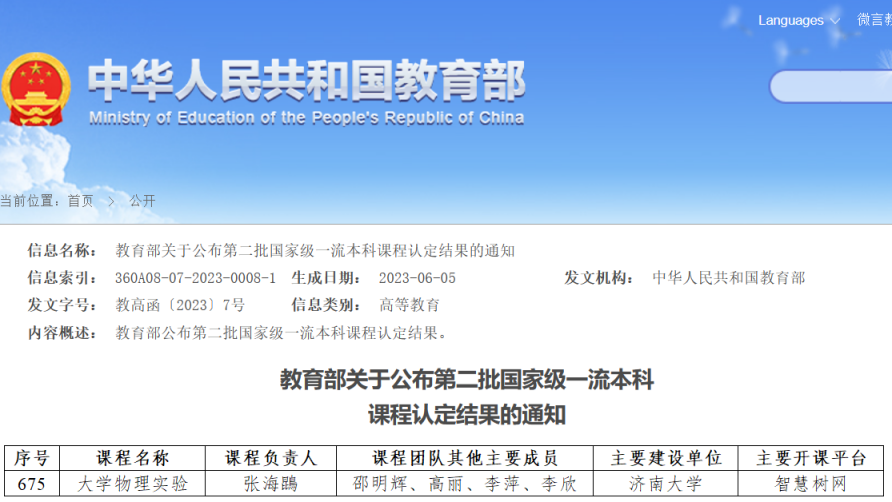 近日,教育部高等教育司公布了第二批国家级一流本科课程认定结果,由我院副院长张海鵾教授团队申报的《大学物理实验》获国家级一流课程认定,这是我院首门国家级一流课程。
