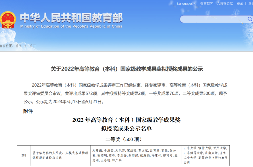 此外,根据教育部网站通知,张海鵾教授参与的一项教学成果被公示为2022年高等教育(本科)国家级教学成果二等奖,太阳成tyc7111cc为第五完成单位。