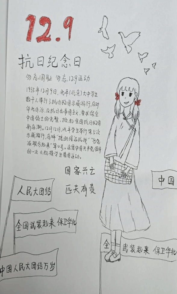 1935年的12月9日,面对内忧外患,热血沸腾的青年们发出了“停止内战,一致对外”的呼声,声声呐喊掀起抗日救亡怒潮。硝烟虽已散去,警钟仍需长鸣,吾辈青年,应学习先辈们的伟大爱国主义精神,以青春之姿,报爱国之热情。